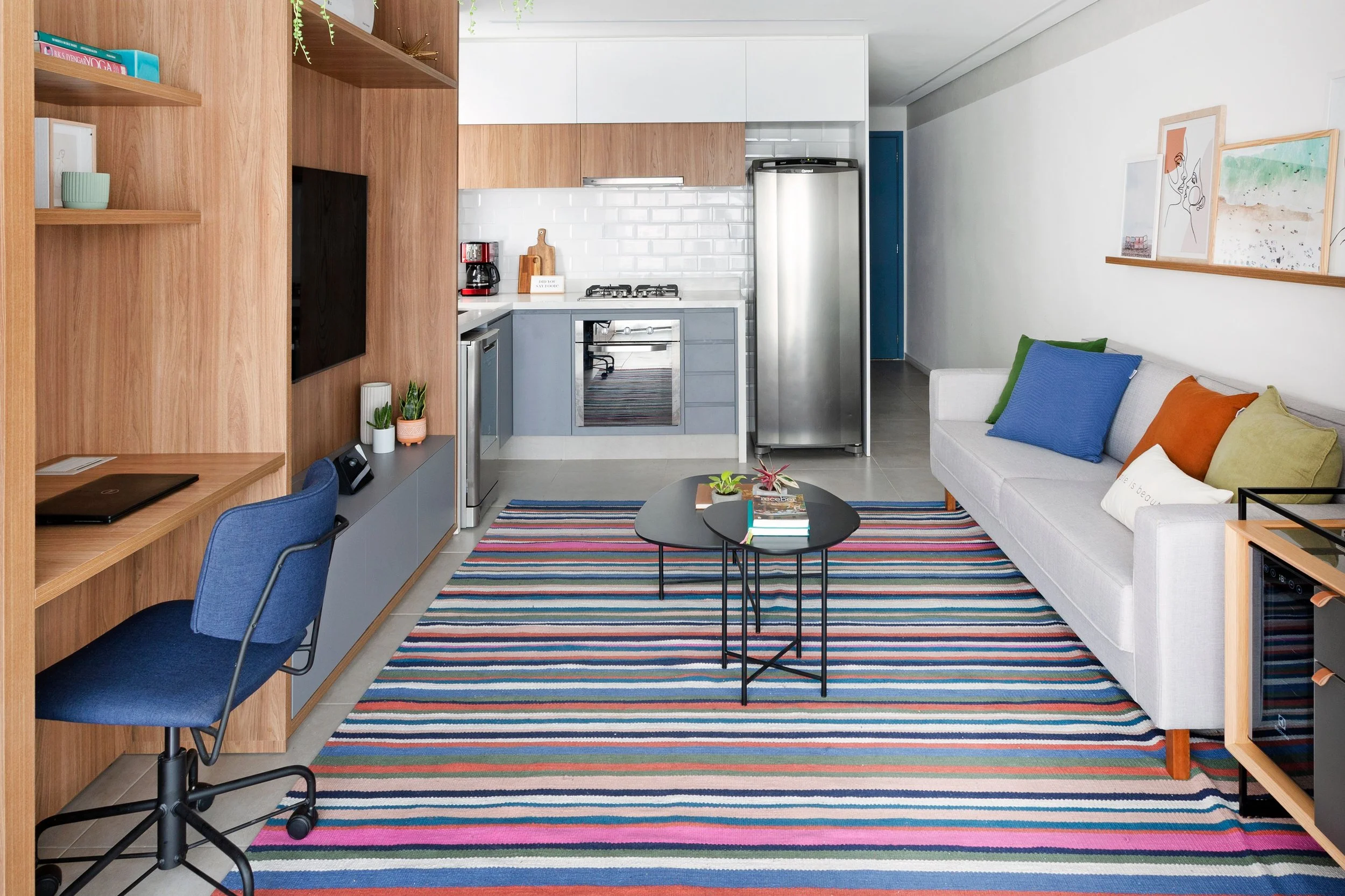 O tapete da @Koord, feito sob medida, é o ponto focal e traz vida e jovialidade para o ambiente. Desde o início do projeto criativo, a ideia era que a peça fosse listrada e cheia de cor. Cada lista tem uma largura diferente e as cores foram selecionadas nas mesmas tonalidades, com pequenas variações, de alguns móveis do ambiente, como as cadeiras da varanda e do home office, e das cores das portas.
